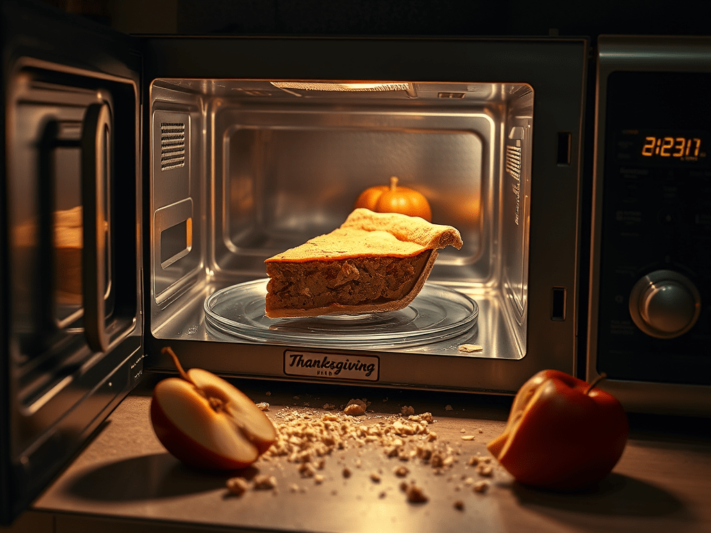 But as I crossed the kitchen, fate—or treachery—beckoned me toward the microwave. There it sat: a pie box, faintly glowing, practically humming a siren song of buttery crust and spiced filling. One peek inside, and there it was—the last slice of Thanksgiving pie, radiating the kind of allure that no apple could ever muster.