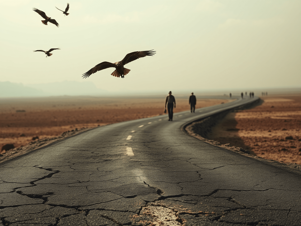 A road. It winds through the wastes like a serpent that forgot its own name. Cracked earth on either side. Fence posts like grave markers. Vultures in the sky, circling nothing in particular, just keeping warm. A man walks it. His boots are flayed open. His eyes are sunburned. His soul is a blister dragging itself behind him.