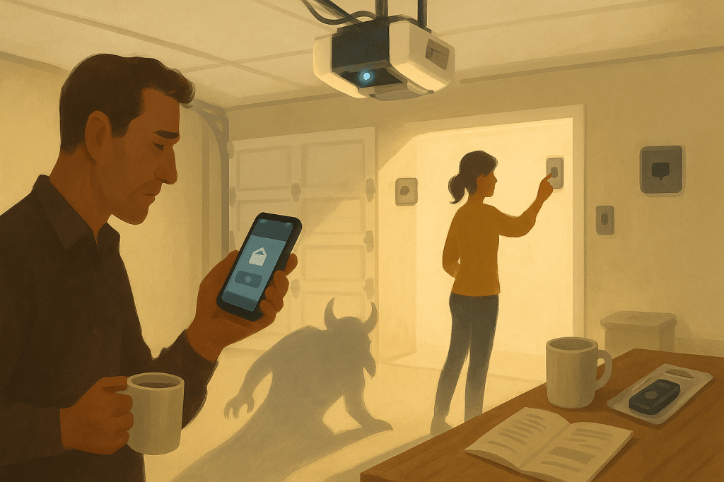 That’s what I did. So when the garage door opener finally died after twenty-five years, I called the repair company that had been nursing it for a decade and paid a thousand dollars for a replacement. The tech arrived—mid-thirties, dark blue baseball cap, beard, sunglasses—affable and chatty. We covered carne asada tacos, the garage door racket, and daily protein quotas. In under an hour he had the new Genie humming. And yet: the in-house wall button turned into a ghost button (opens nothing, closes nothing); he issued only one new remote, leaving my wife remote-less; and he didn’t sync the unit to the Genie app. “Easy,” he said, packing up. “Just follow the directions.” Then he vaporized.